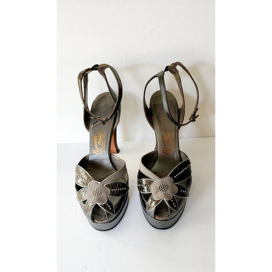 Vintage 40s High Heel Platform Shoes Maryjanes Gray Silver Floral Manning Original