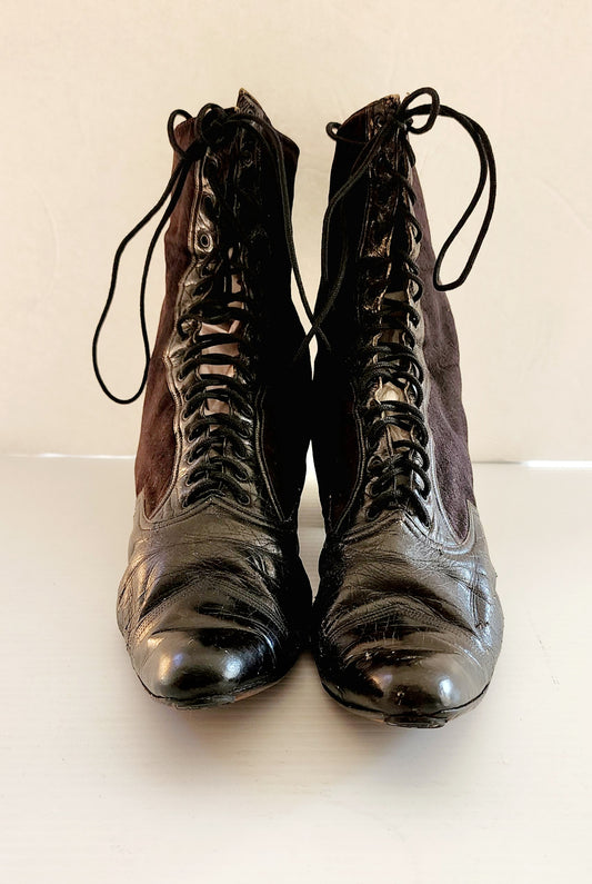 Antique Granny Boots Lace Up Black Silk & Leather Edwardian