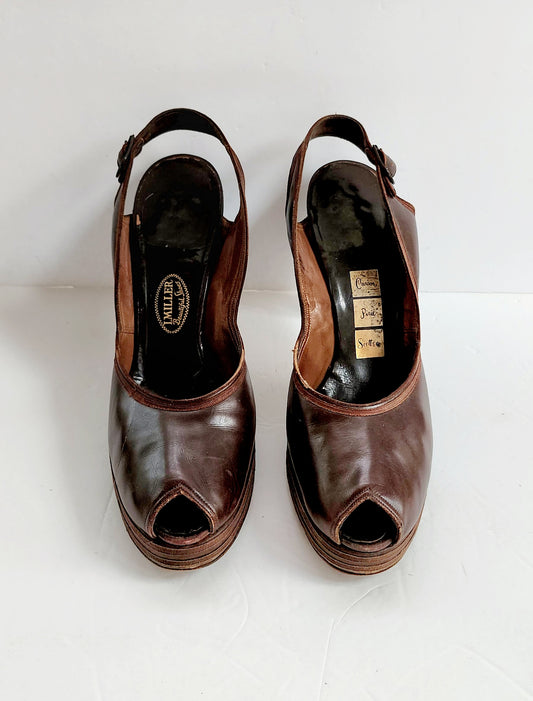 40s Brown Shoes Peep Toe High Heel Slingbacks Size 10 RARE