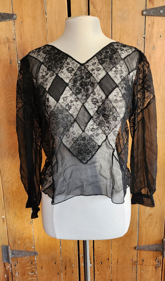 Vintage 30s Blouse Black Silk Lace Long Sleeved