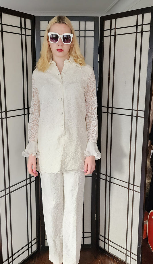 Vintage 70s White Lace Pant Suit Sodi Boho Bride Disco Wedding