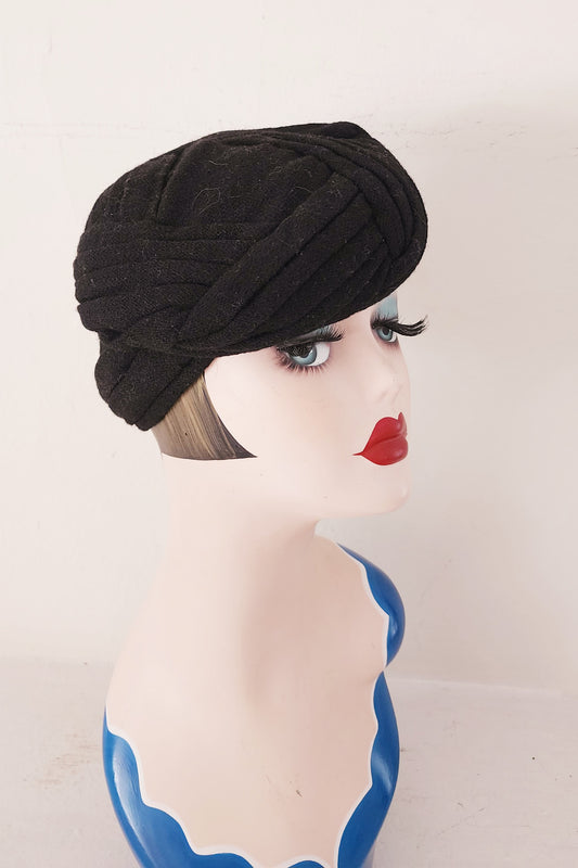 1930s Black Cloth Hat Rear Strap Debutante Room Marshall Field