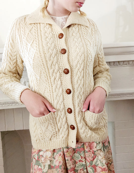60s Irish Sweater Cardigan Barnas-Mor Cream Wool Donegal Handknit NWT