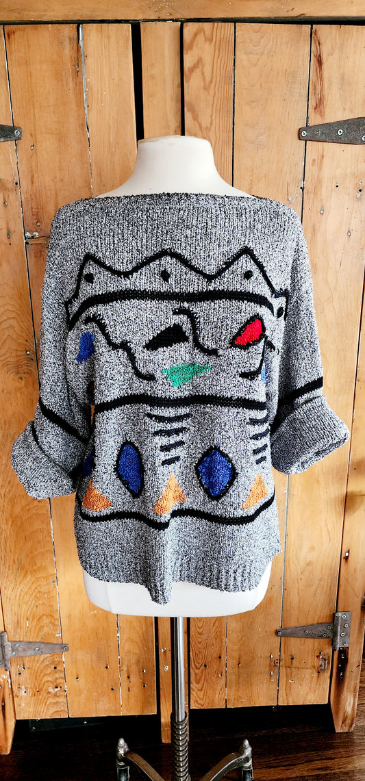 80s Gray Sweater w/Multicolored Graphics Mariea Kim