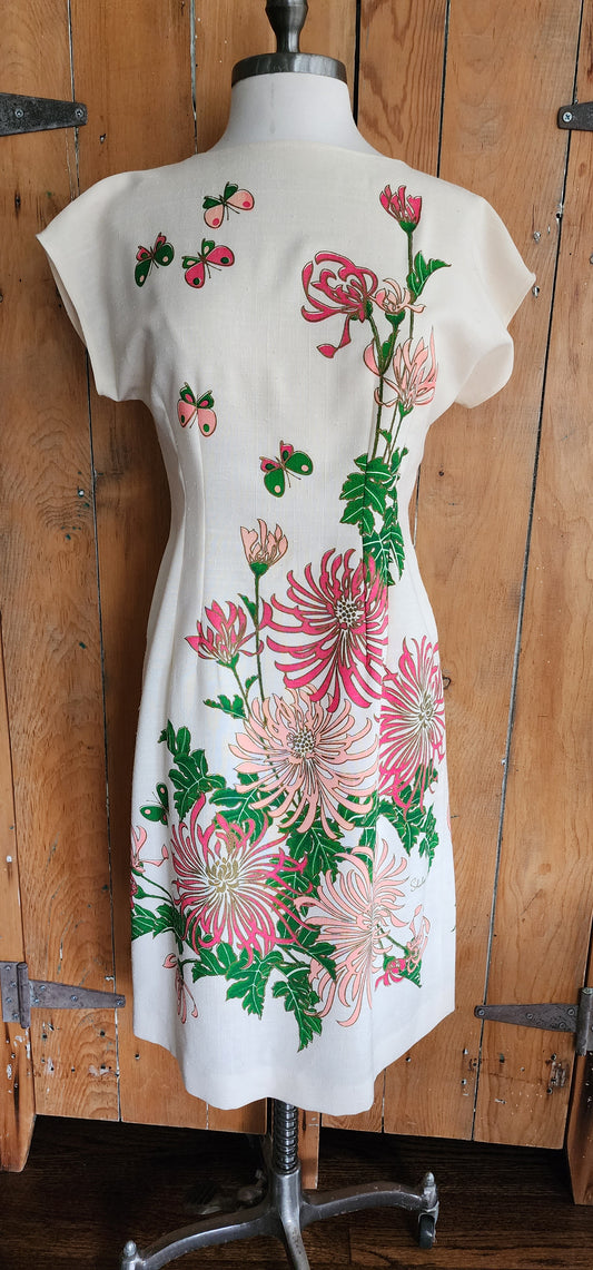 60s Shaheen Dress Multicolored Floral Butterfly Print Hawaiian Tiki