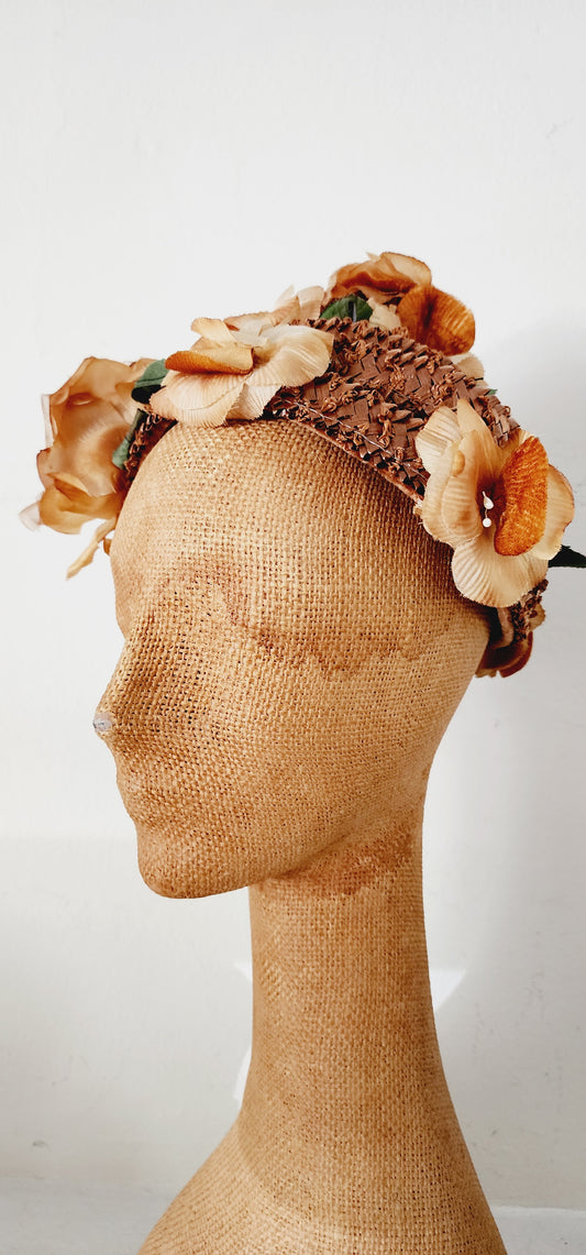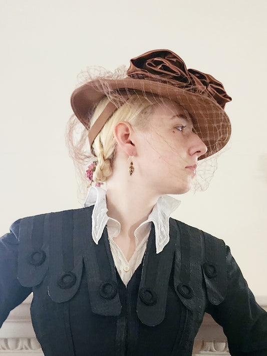 80s Brown Floral Hat Neo Edwardian Style w/Veil