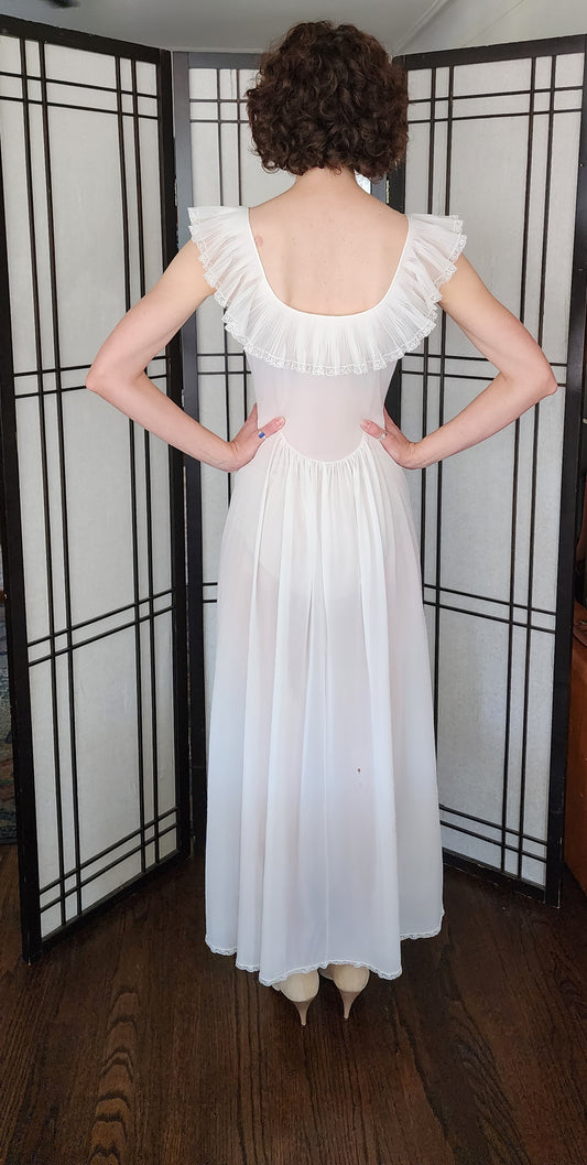 40s White Nylon Night Dress Long Slip Ruffled Collar AS IS