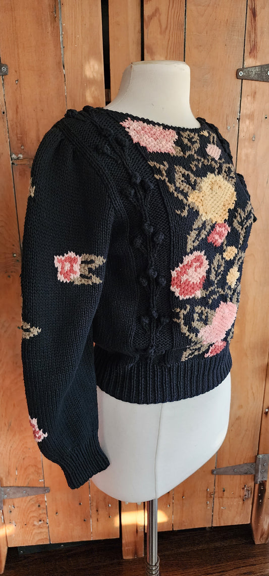 80s Black Sweater Pink Rose Flowers Liz Claiborne