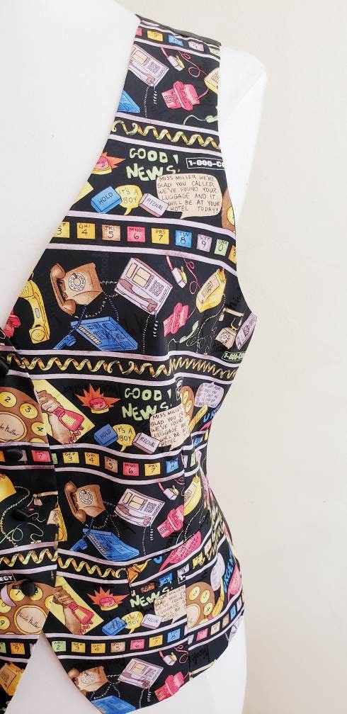 1990s Nicole Miller Silkprint Vest Telephones Text Messages Calls Calling Whimsical / 90s Designer Colorful Novelty Vest / L