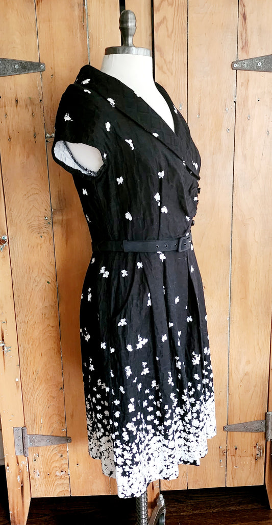 90s Does 50s Dress Black w/White Floral Print Julian Taylor