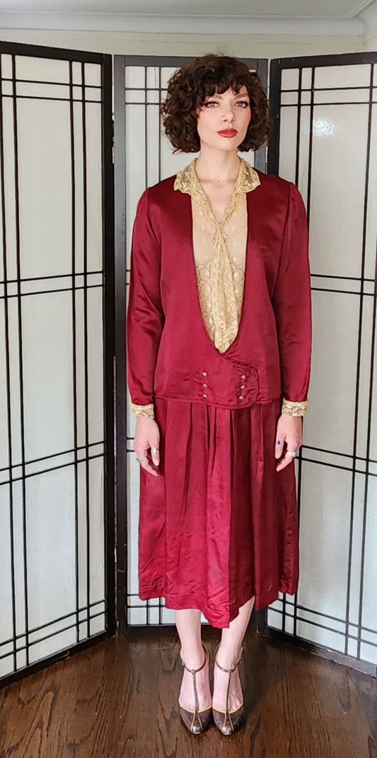 1920s Day Dress Long Sleeves Burgundy Red Silk Beige Lace M /L