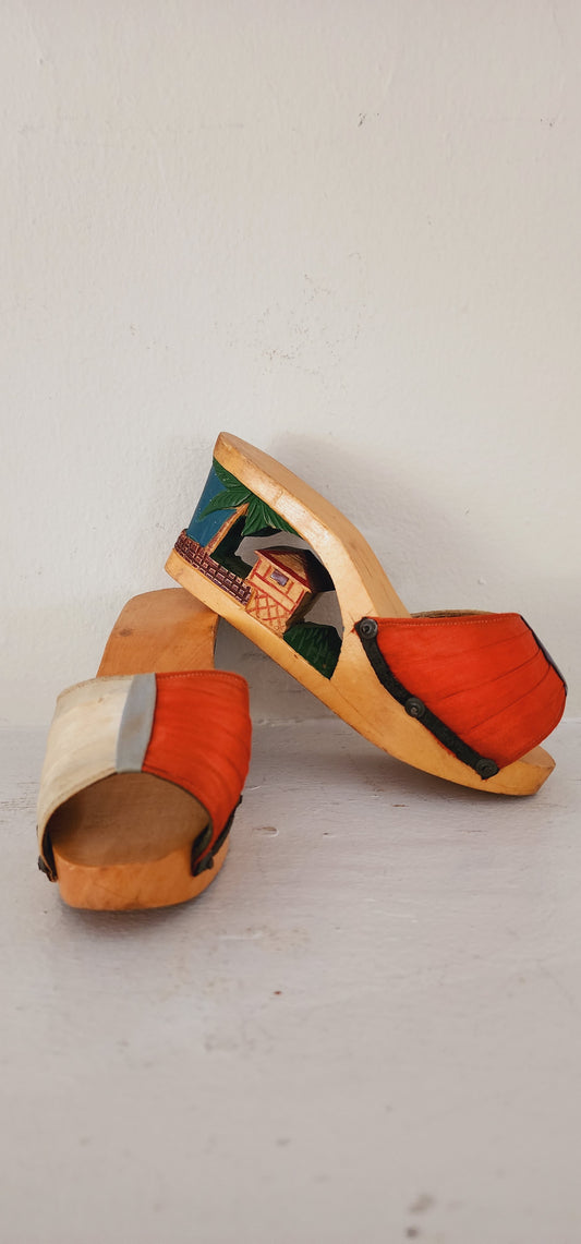 1940s Carved Wooden Platform Shoes Tiki Village Size 6
