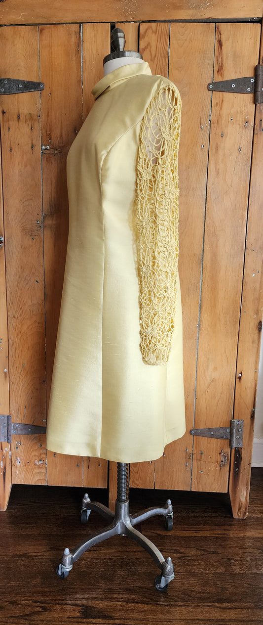 60s Yellow Silk Dress Crocheted Long Sleeves L