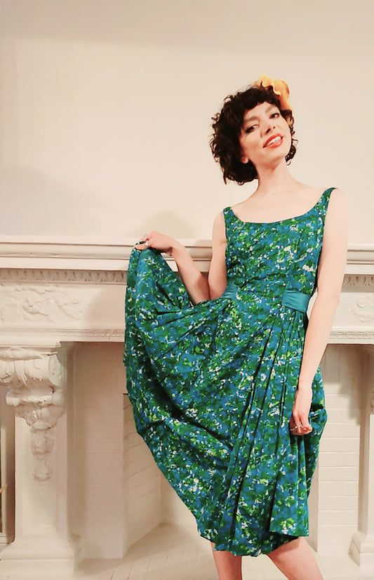 50s Dress Green Cotton Floral Print Party Dress w/Sequins by Lee Claire