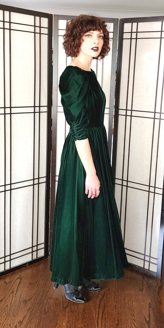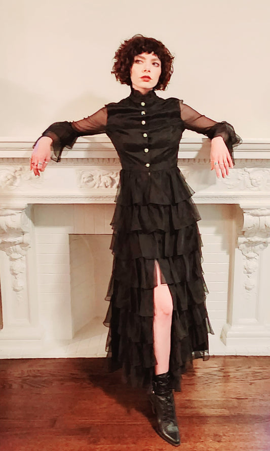 70s Black Maxi Dress in Silk Organza Rhinestone Buttons by Melinda / M