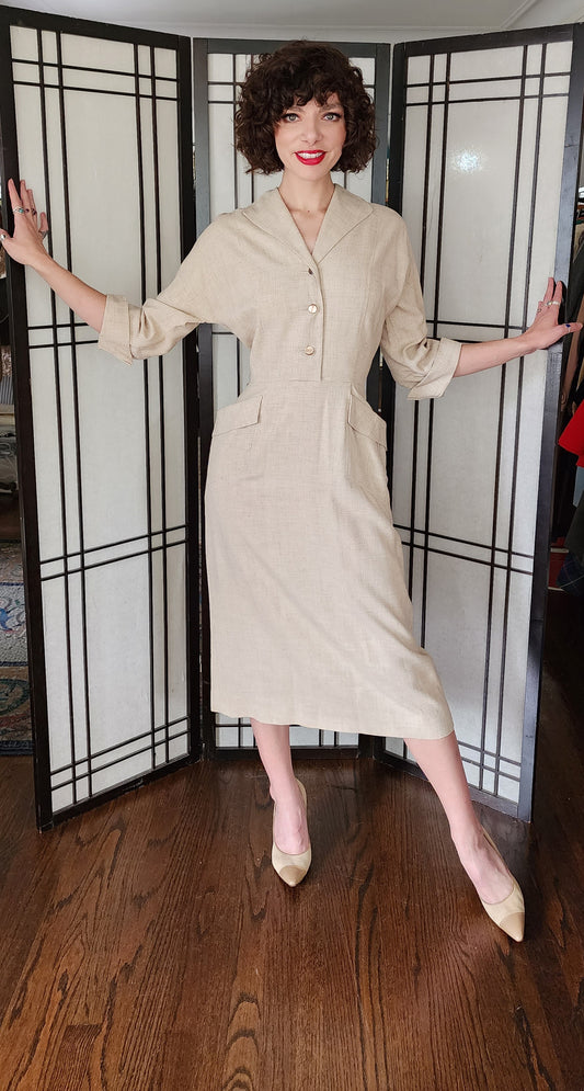 40s Beige Wool Shirtwaist Dress by Jack Mann