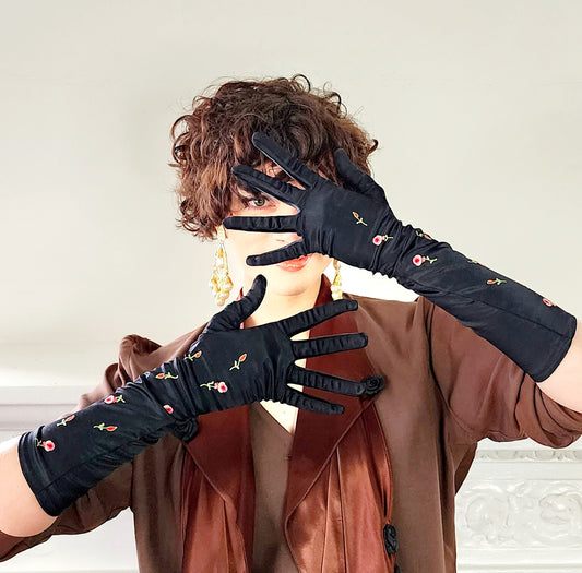 1950s Black Satin Gloves Pink Floral Embroidery