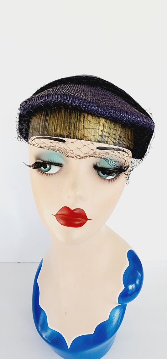 50s Navy Blue Straw Hat in the Close Style w/Velvet and Veil by Marshall Field