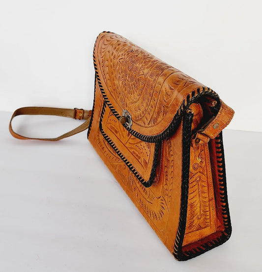 70s Tooled Leather Shoulder Bag Mexican Aztec Motif by National Bags