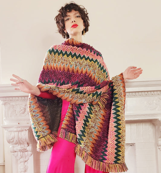 Knit Oversized Poncho in Rainbow Zigzag Pattern in Boho 70s Style