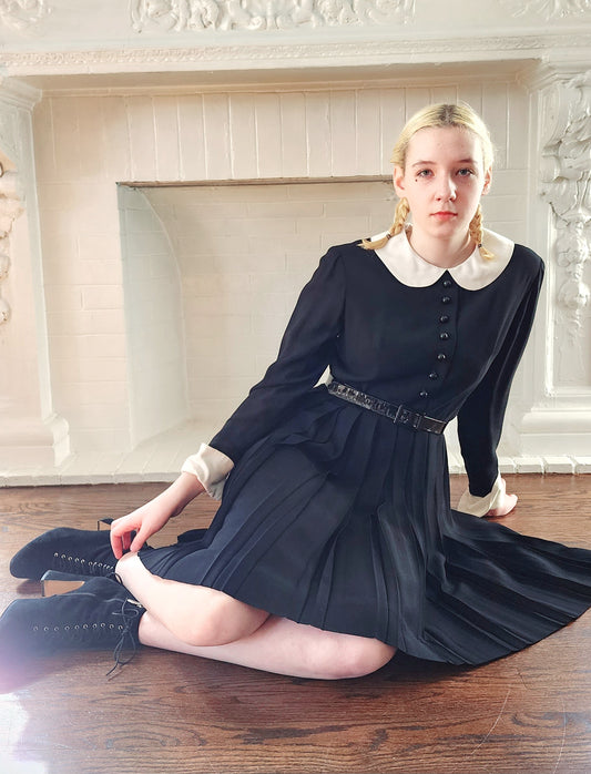 60s Black Mod Dress with White Collar and Cuffs & Pleated Skirt Wednesday Adams Style / S
