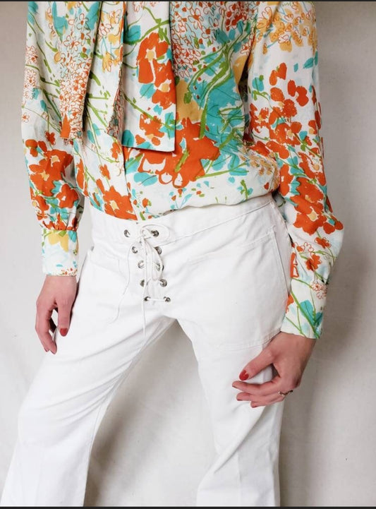 1970s White Denim Pants Corset Lace Bell-Bottoms by Action Man Slacks 30x30 Mens/Unisex