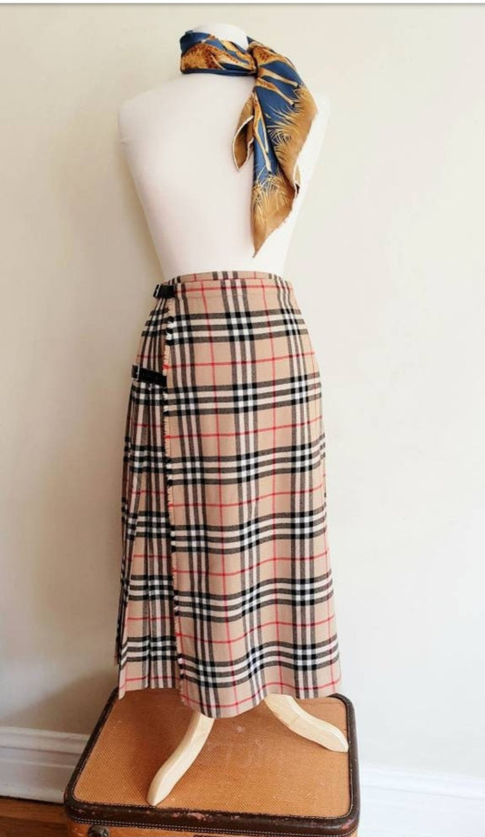 1970s Burberry Skirt Signature Plaid Wrap Around Kilt Archive Beige / 70s Designer British Tartan House Check Pleated Midi Skirt / M