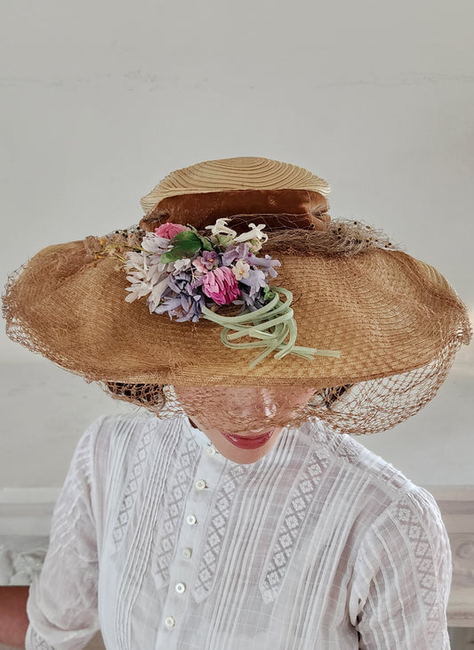 30s Beige Straw Summer Hat - Wide Brimmed with Veil and Flowers