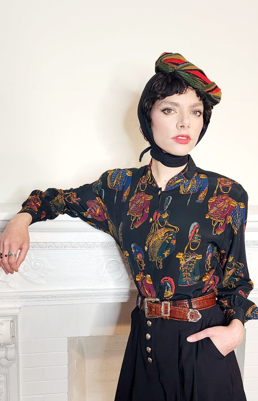 80s Liz Claiborne Long Sleeved Blouse Marching Band Print Dark Rayon M