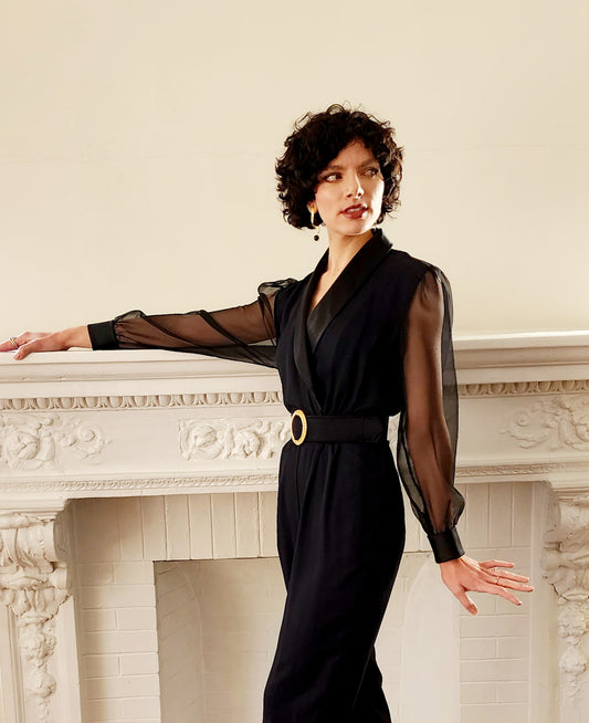 80s Black Jumpsuit with Long Sleeve Sheer Sleeves Gold Rhinestone Buckle Belt by J.R. Nites Small