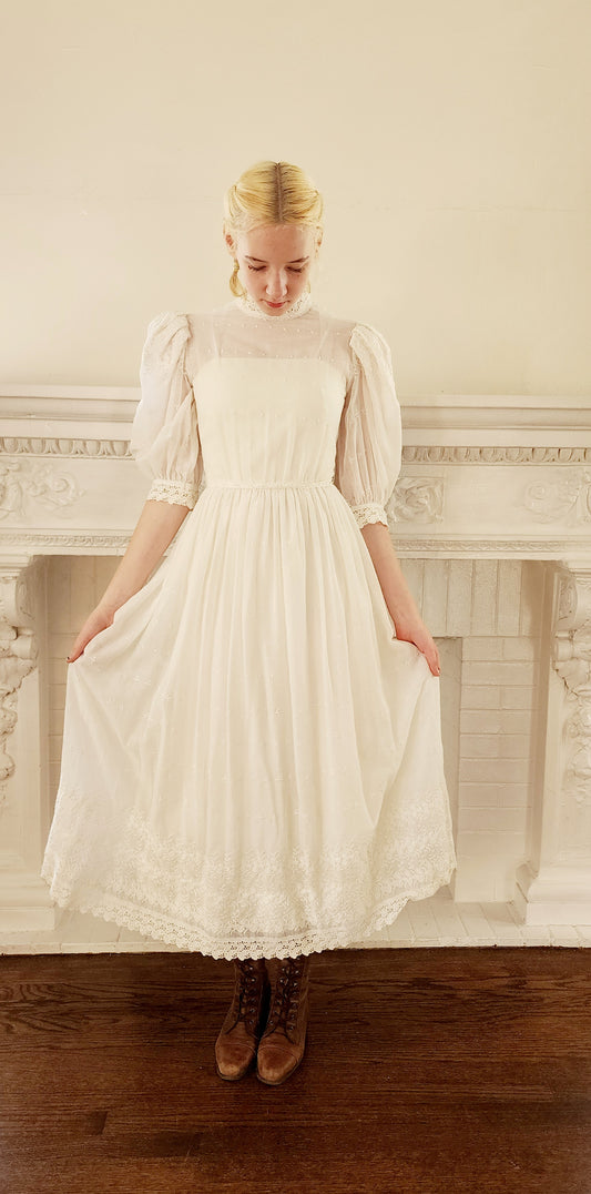70s White Maxi Dress Neo Edwardian Meets Prairie Style Dotted Swiss & Eyelet Cotton XS