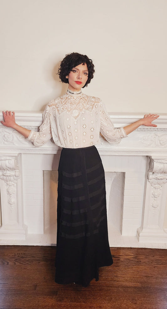 Antique Edwardian Long Black Wool Skirt with Embroidered Trim Medium