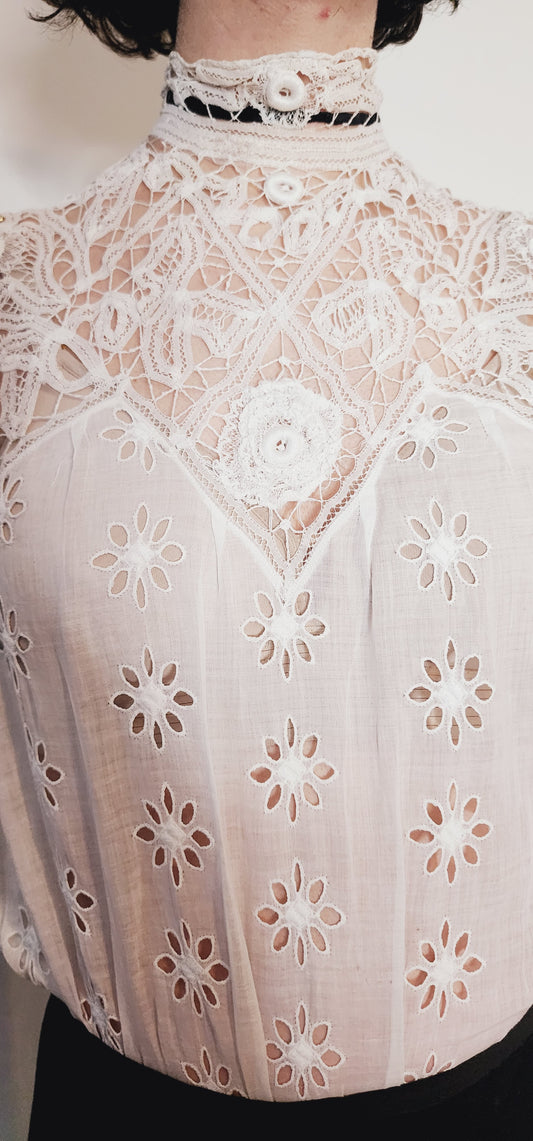 Edwardian Blouse White Cotton Lace with Eyelets and Back Ribbon Closure Small