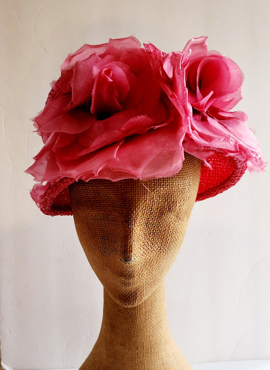60s Pink Straw Bucket Hat Large Flowers Fuschia Spring Summer Garden Party