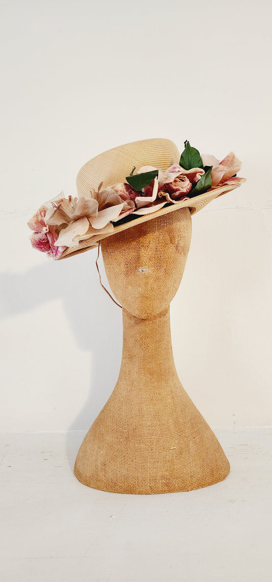 50s Beige Straw Hat with Pastel Flowers Wide Brim by Chez Original