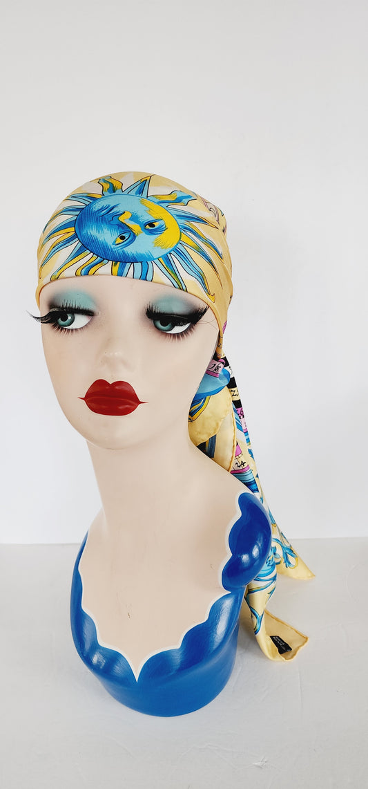 90s Silkprint Scarf w/Horoscope Chart Zodiac Design Yellow Blue Pink