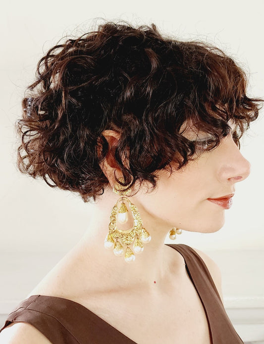 60s Chandelier Earrings Dangly Oversized Clips in Hammered Gold w/Faux Pearl Beads