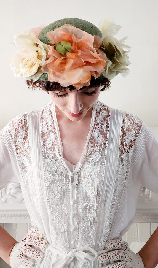 50s Norman Durand Original Pastel Floral Hat Green Straw Summer Spring Garden Party Shabby Chic