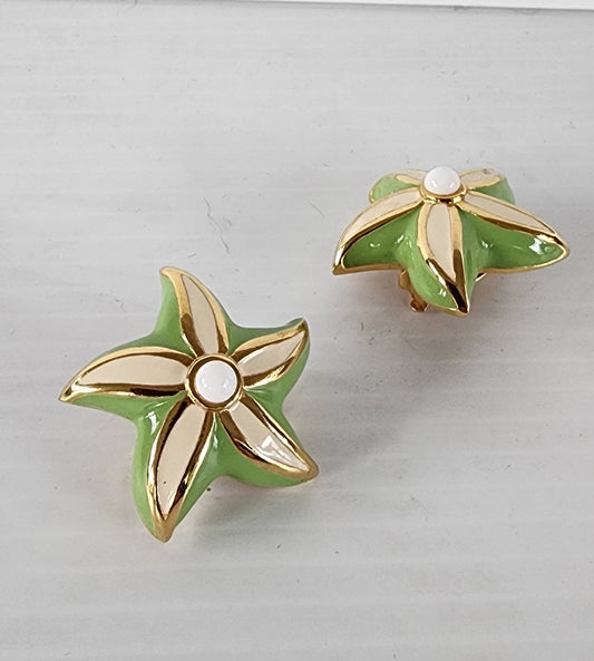Vintage 80s St John Earrings Starfish Seastar Green Enamel Clips