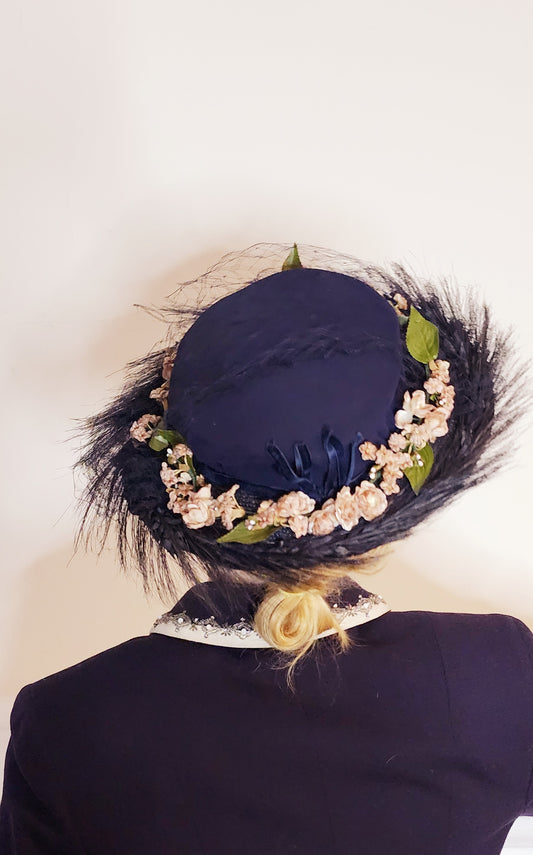 50s Navy Blue Straw Flat Top Hat Black Horse Hair Quills & Cream Flowers Shabby Chic