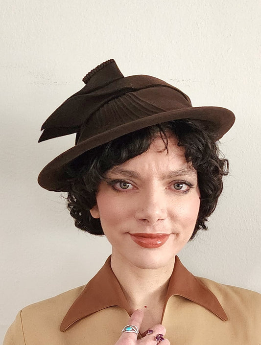 30s Brown Wool Hat with Ribbing and Asymmetrical Sash Panel Blum's Evanston