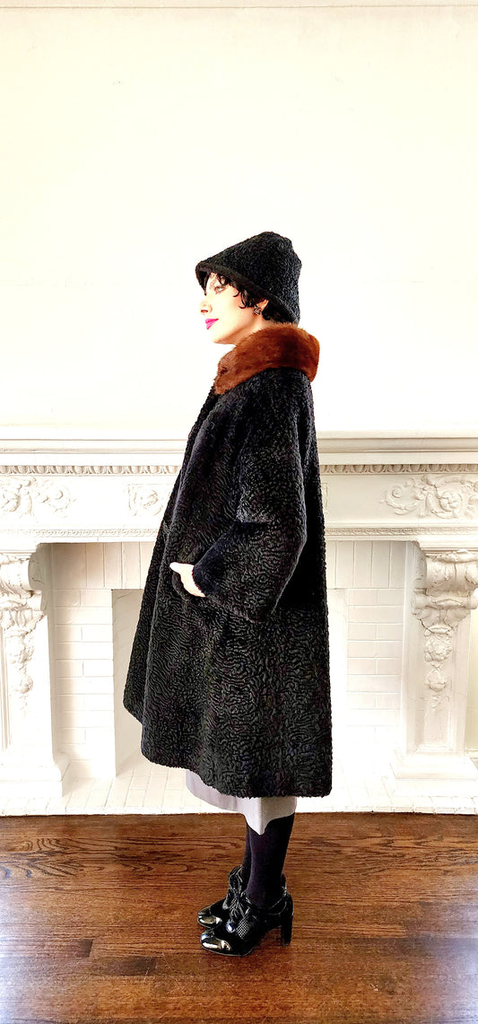 60s Black Coat in Faux Persian Curly Wool by Sai Shai & Brown Mink Collar Howard Lyon Inc