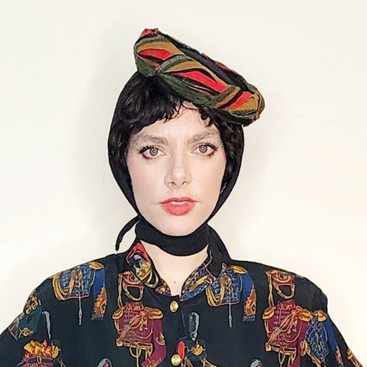 40s 50s Black Wool Scarf Panel Hat Colorful Twisted Braid Trim
