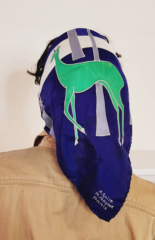 70s Scarf Modernist Print Gazelle in the Woods Green Navy Blue White J Guise Royale Paris