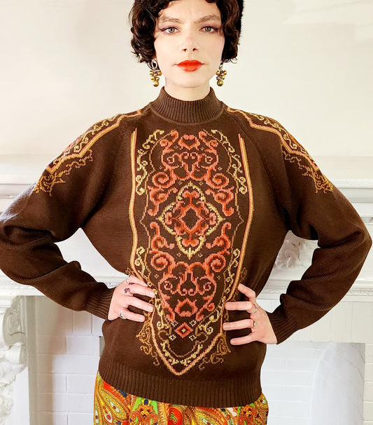 70s Wool Brown Sweater with Baroque Floral Print Cift Geyik Turkey