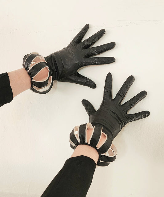 1940s Black Leather Gloves with Cut Outs for Balloon Wrist Jester Style