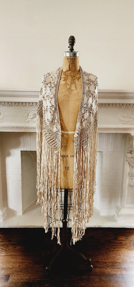 Vintage Cream Shawl or Wrap Silk Knit with Long Fringe and Openwork Lace / Neo-Edwardian