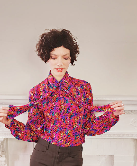 80s Colorful Button Down Shirt Multicolored Fuschia Pebble Print Long Sleeves Neck Scarf by Harlan