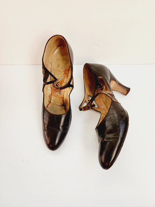 1920s Brown Leather Shoes Mary Janes High Heel Flapper Shoes