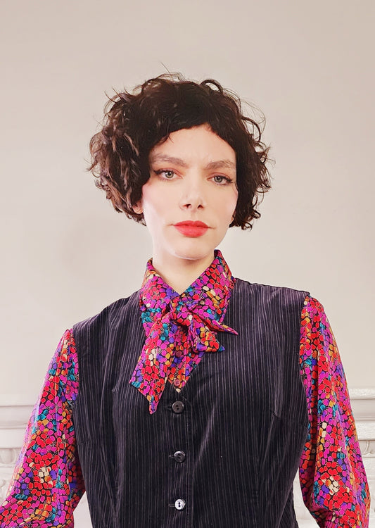 70s Summer Crop Top Button Down / Sleeveless Shirt in Navy Blue w/White Flowers